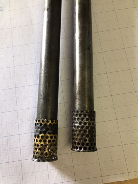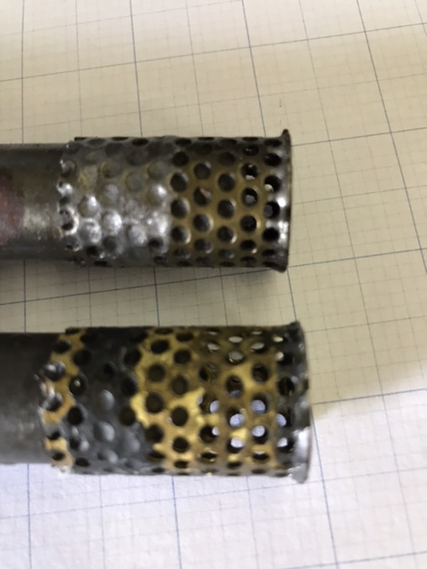 So, being an ME, I counted holes on both tubes and compared them with the thru hole at the end of the tube. As you can see, the thru hole is roughly .400 ID, and both tubes are very close to the same dimension. The original tube, with 33 holes around the periphery, and 23 holes on the end, had an equivalent open area of .288 sq. in. The NOS tube had 87 total holes, with an open area of .448 sq. in.