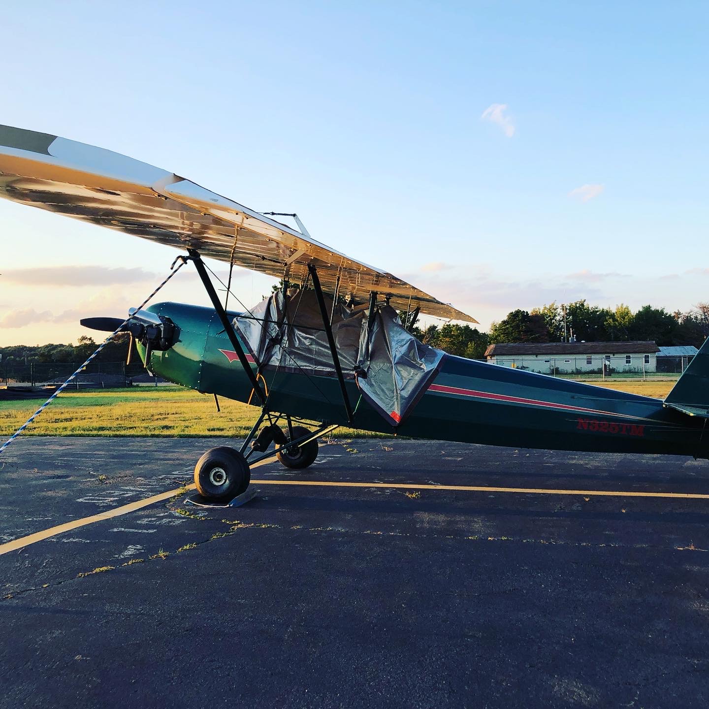 I had called ahead to KHZL before leaving Bellefonte, in hopes of securing a hangar for the night, but the airport didn't have any available, and the weather forecast was good, so instead I dragged 5TM over to a ramp tie down, and we cut up a tarp to protect the cockpits from the overnight dew. The results won't win any beauty contests at Brodhead, but got the job done at the end of a long day!