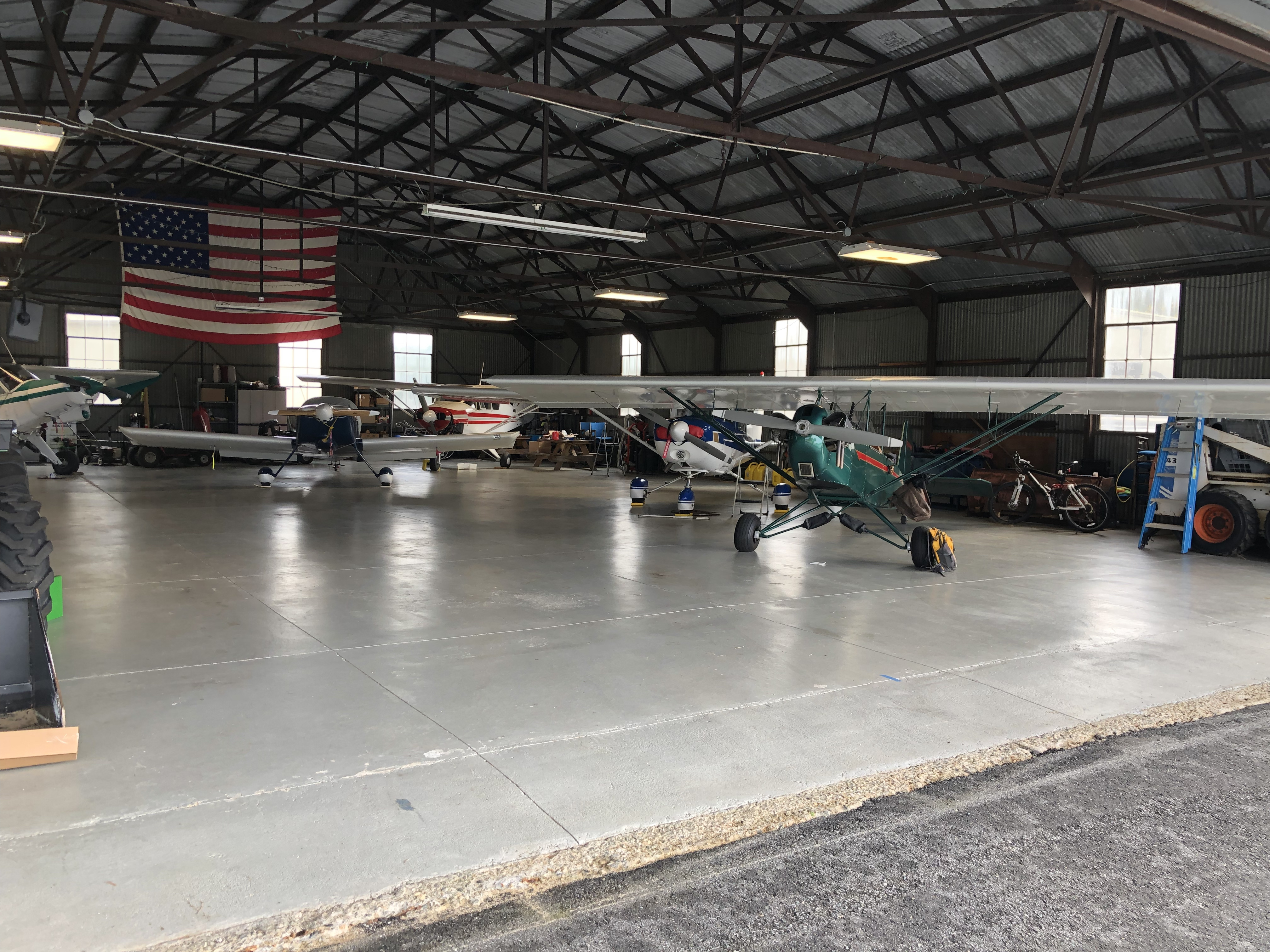 By 2AM, the forecast had deteriorated still further. TAFs across the entire region were calling for 30-40knts of windshear at 2000', and the ceilings in western PA were dropping fast. Once the storms hit, it would be 48 hours or more until they were expected to dissipate or move out to sea, and that would put me at the bitter end of my off-shift. To make matters worse, the plane was parked outside and so far as I knew, there still wasn't a hangar available. I had low confidence that 5TM would fare well on a tie down through the forecast torrential downpour and high winds. Early on, we made the decision that flying out was not an option. Given the windshear, which was by 6am, being actively reported at Wilkes-Barre airport, only 25 miles north, I was not comfortable subjecting myself or the airplane to the developing conditions, especially while crossing the highest terrain we would have faced to date. A Google search revealed that there was a 26' Penske truck available for rental nearby, though, and so the plan became to pull the wings off the plane and load it into the truck. We had the contents of my old hangar in the back of the car, and there was a Lowes nearby, so I felt that we had the resources to get the job done, but wasn't very happy about it. It seemed very unlikely that we would successfully dismantle the plane and then get it up into the box truck without doing some sort of damage, to say nothing of the toll that a 9 hour drive in the back of a truck might take on it. Before taking drastic action, however, we decided to go back up to the airport and see if there wasn't some corner of a hangar that we might be able to beg our way into. In fact, there was. An early morning transient jet departure had freed up a corner of a hangar, and the Pietenpol fit snugly in the corner leaving ample room to spare for other transients to fit in. The folks at KHZL went above and beyond to ensure that the plane was safe, and as I type this, N325TM sits safe (and intact!) waiting for the weather and scheduling window to reopen, so that we can resume our journey.