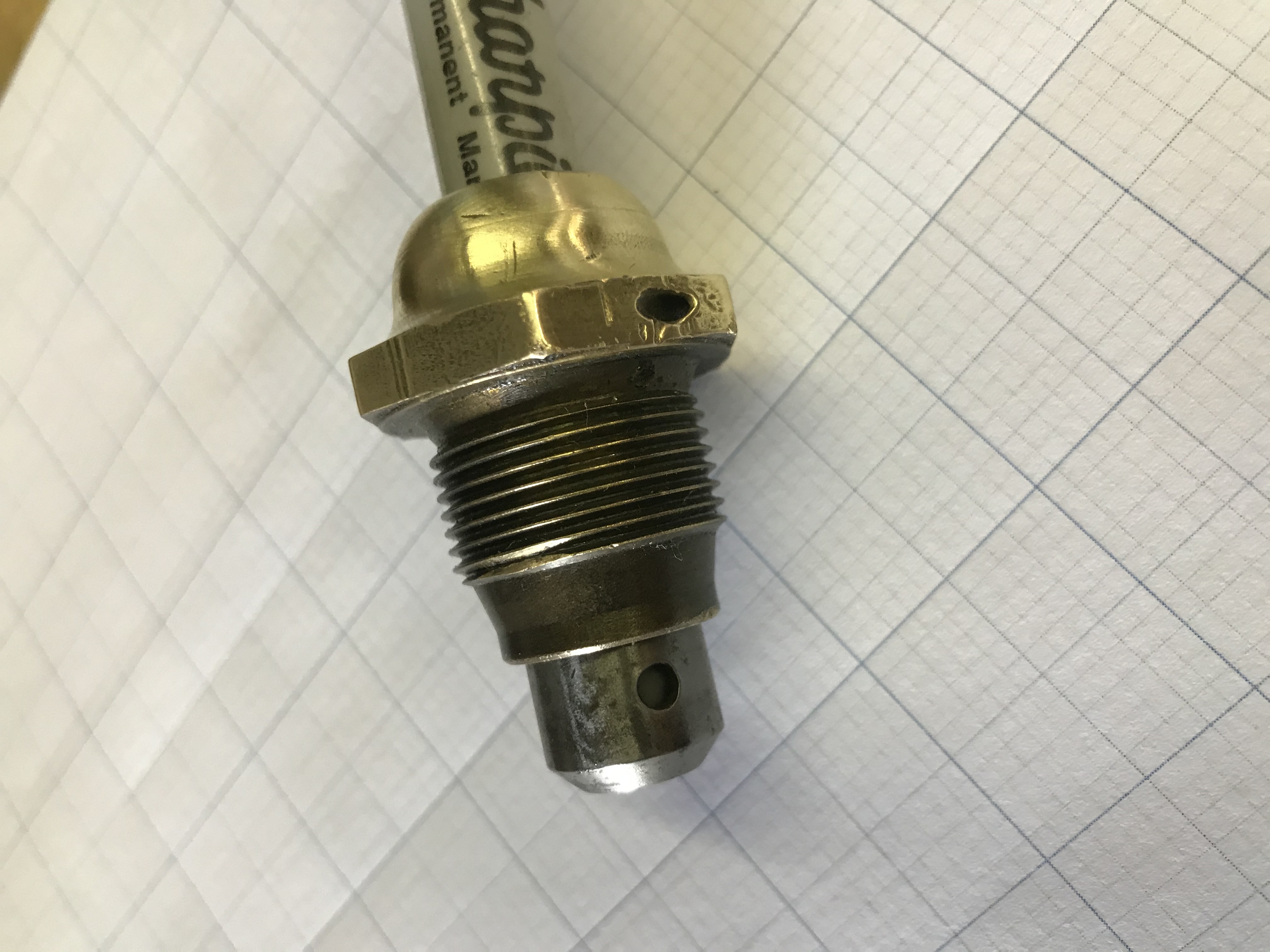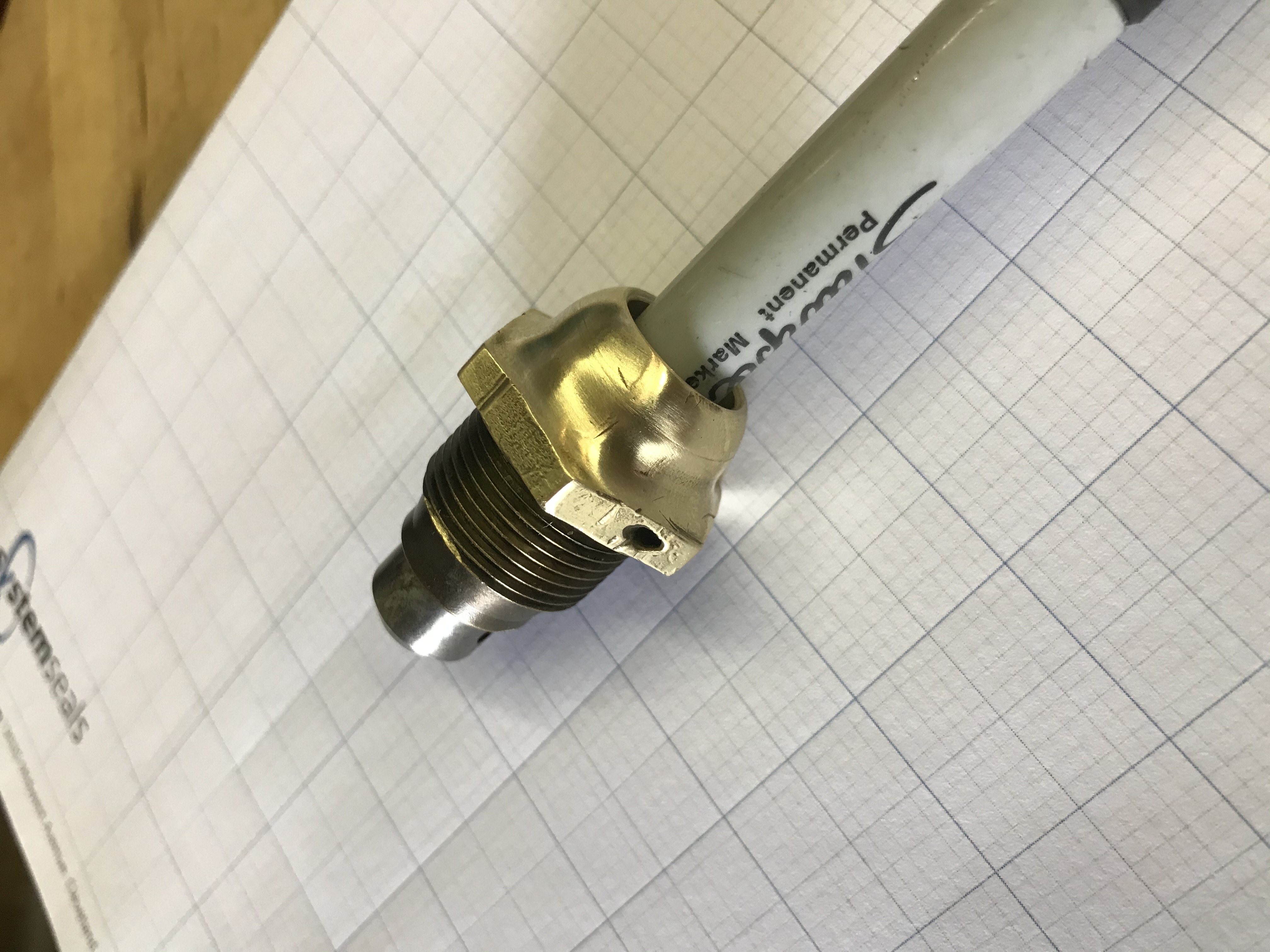 One installed like this, the Sharpie allows the user to rotate the Valve. To use, apply a slight amount of lapping compound on the face of the Valve, apply very light force - i.e., just touch - to the seat, and rotate back & forth thru 90°, then lift off the seat & rotate 60°, and continue. Do this several times till the entire seat is cleaned up all around.