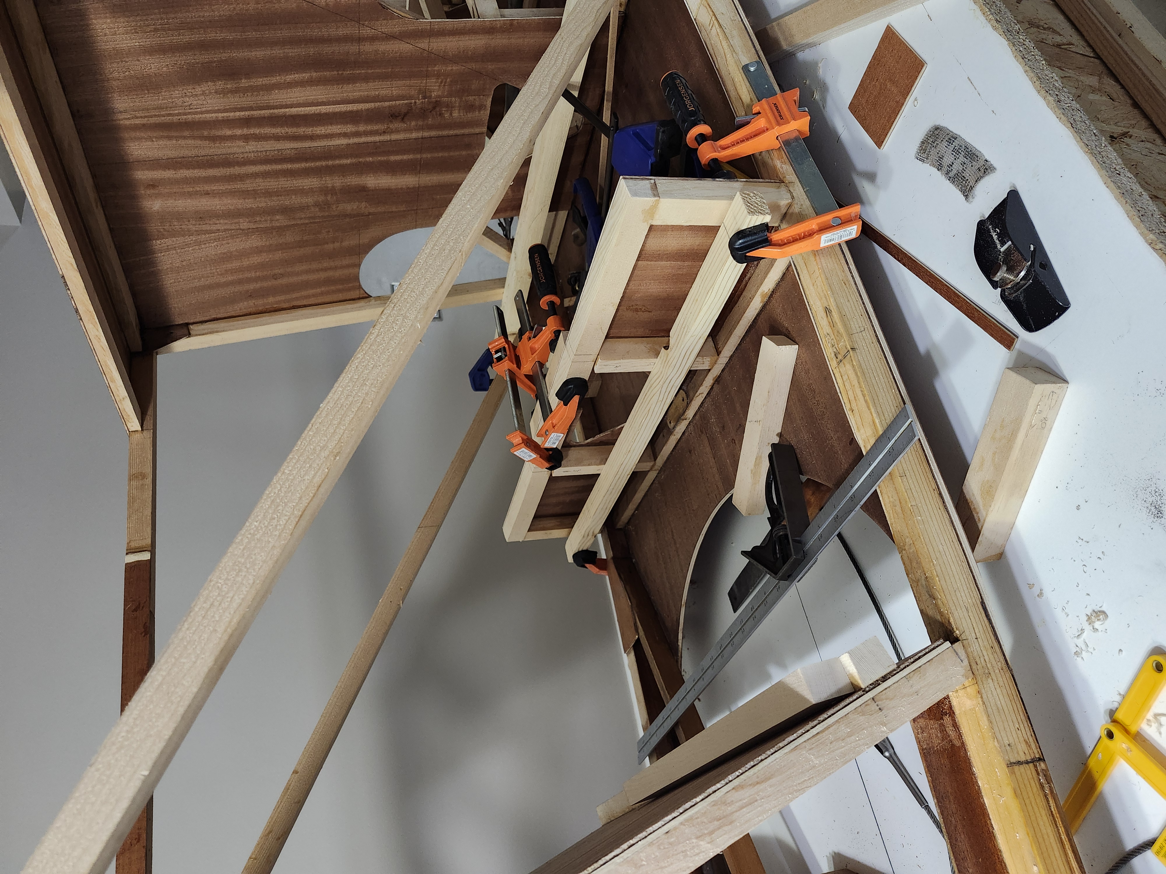 So, I decided I wanted the rear seat bottom removable. Measured and measured. Cut out the pieces, glued in the spacers and fit the seat bottom. Looks good. Hmmm. I clamped plywood to the sides. The seat bottom won't clear the diagonals. So rework the seat bottom. Clears now! 20251001_075440.jpg ...