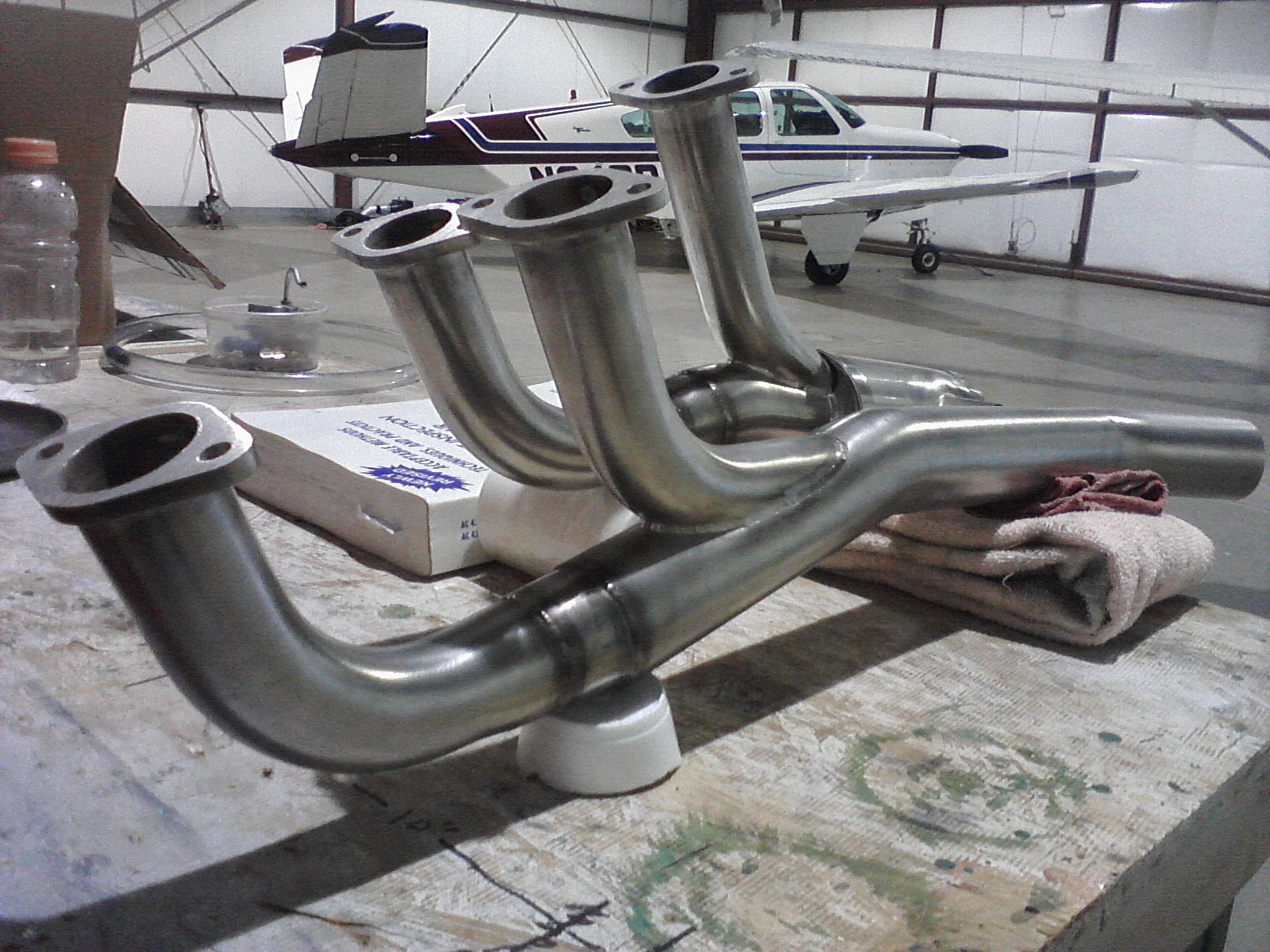 1 set stainless steel extractor exhaust manifolds for small Continentals. Integral heat muff on right. Nice fit on Air Camper. Made by Vetterman Exhaust, Inc., Oral, SD. New, never installed. $450.00.