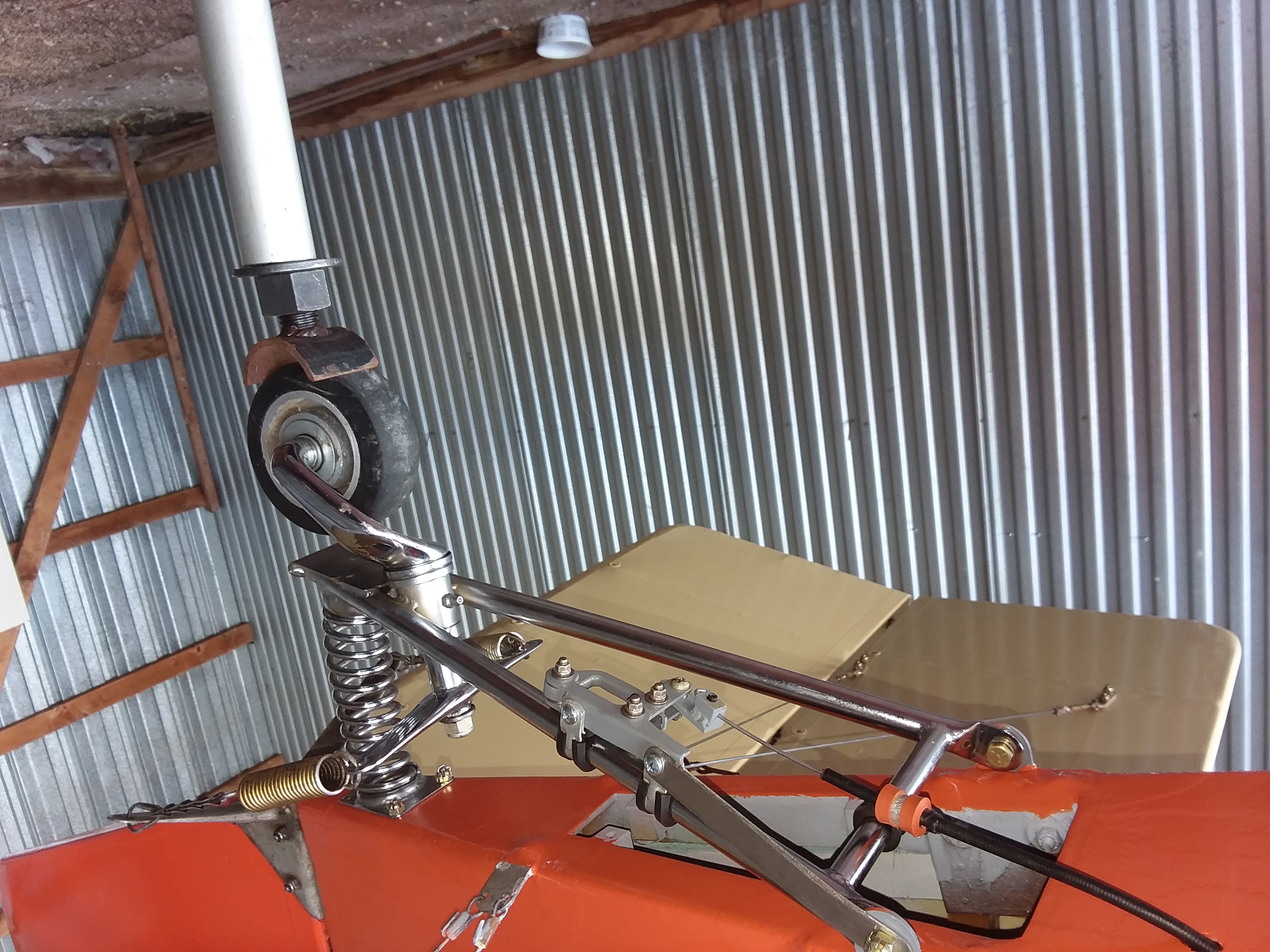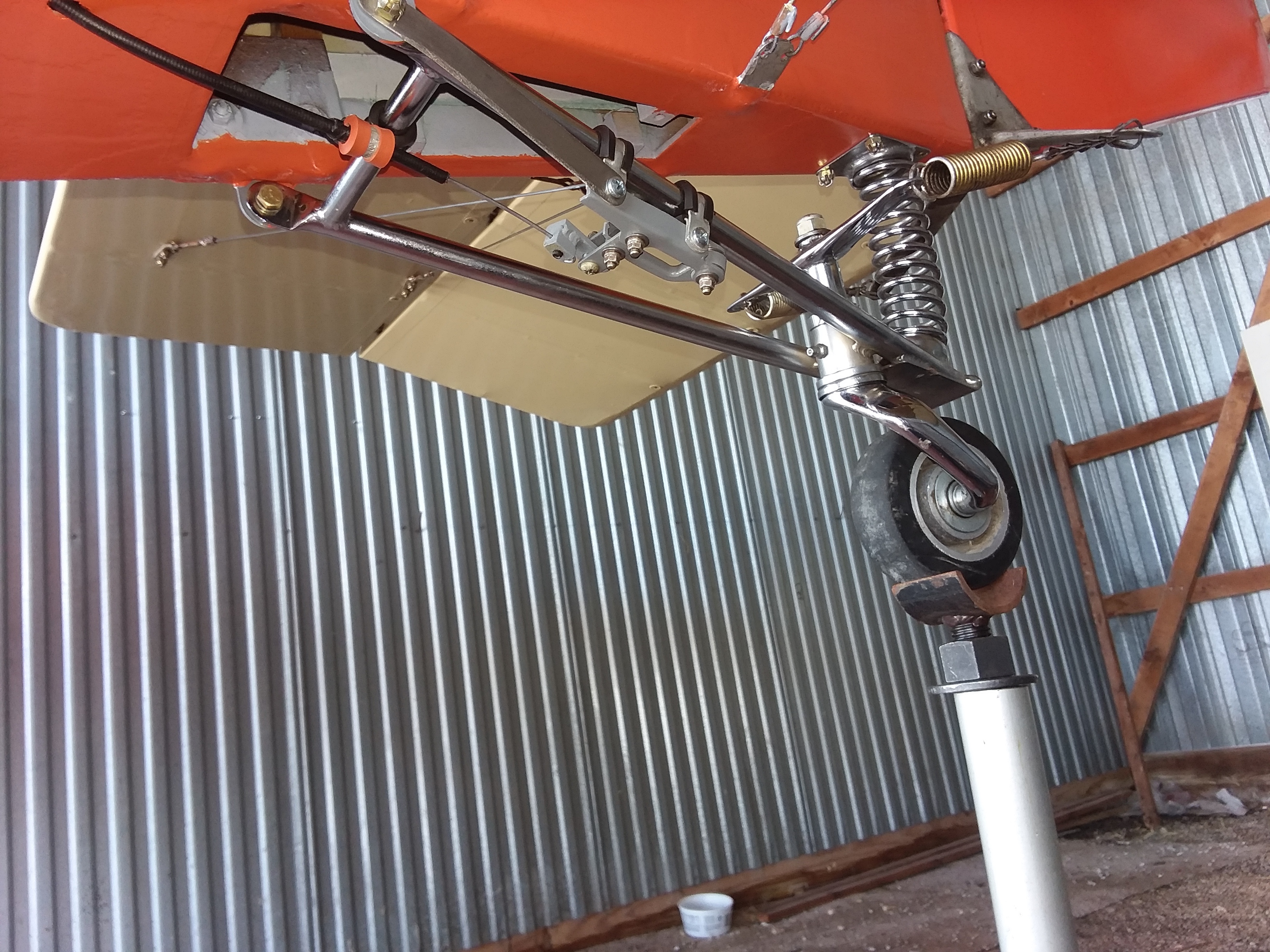 The paint is rattle can Rust-oleum Husqvarna Orange. The closest I could get to whatever paint Ken used in 1999 on the Superflite fabric system. I just know he bought local automotive paint. The tail hook is something I made while still working at a certain airline. Nice light titanium hardware! It always made me nervous not to have the Piet secured when propping it. I couldn't get Ken to take the time to install it. I put it on after he died. Works well.