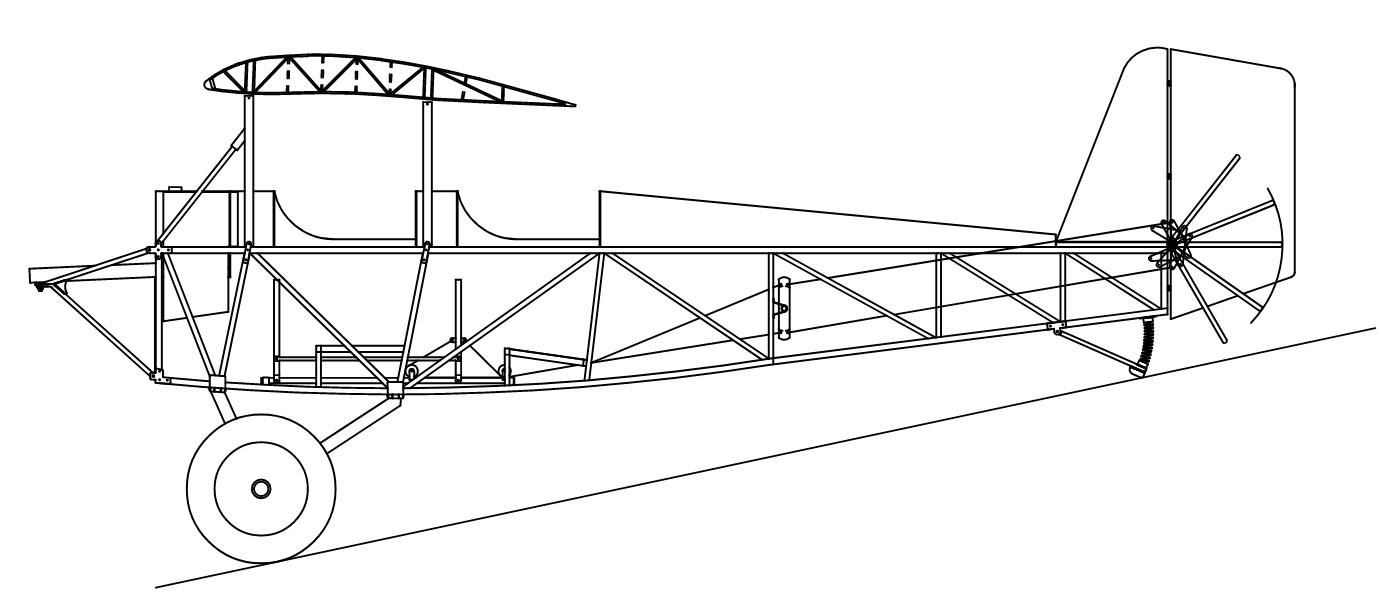 Just for the heck of it and for studying where things are relative to one another with the plane in the straight and level position, I've attached a plot of a CAD layout that I did of a conventional Air Camper pretty much by the plans (no brakes; Ford A engine mount; vertical cabanes)- except that I added the forward fuel tank that is on 41CC just to see where it fell relative to the axle, wing, and everything else. I don't think that a Ford can be installed with a fuel tank in that location though.