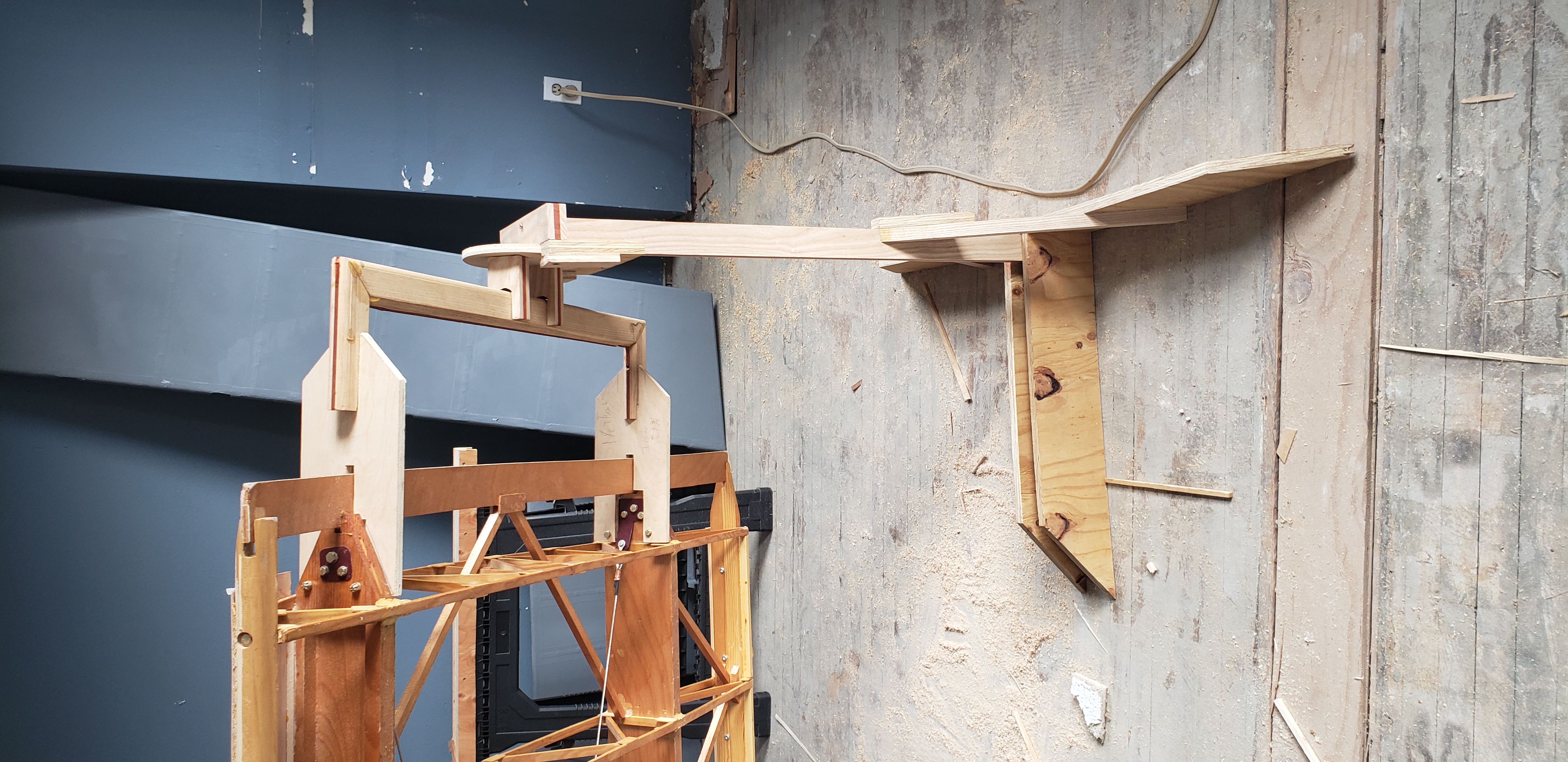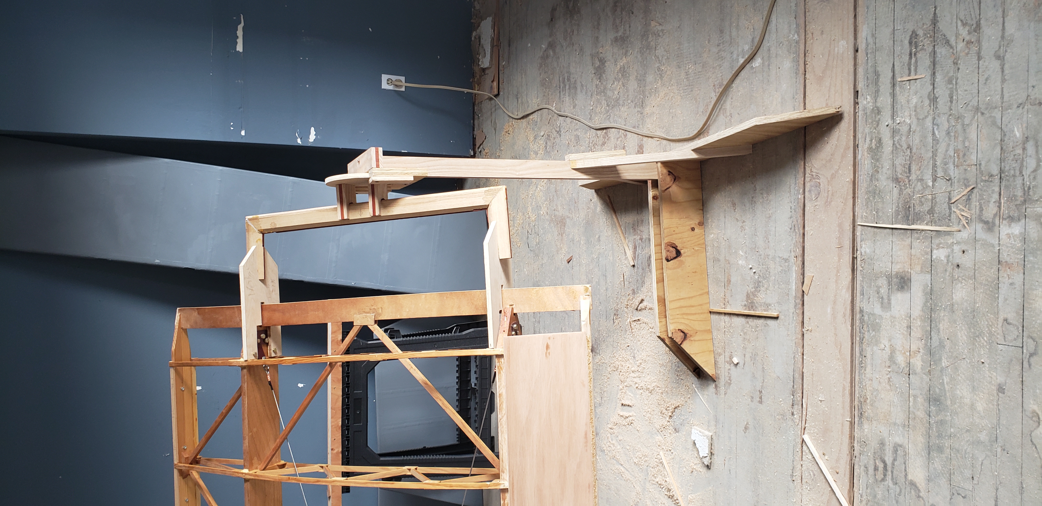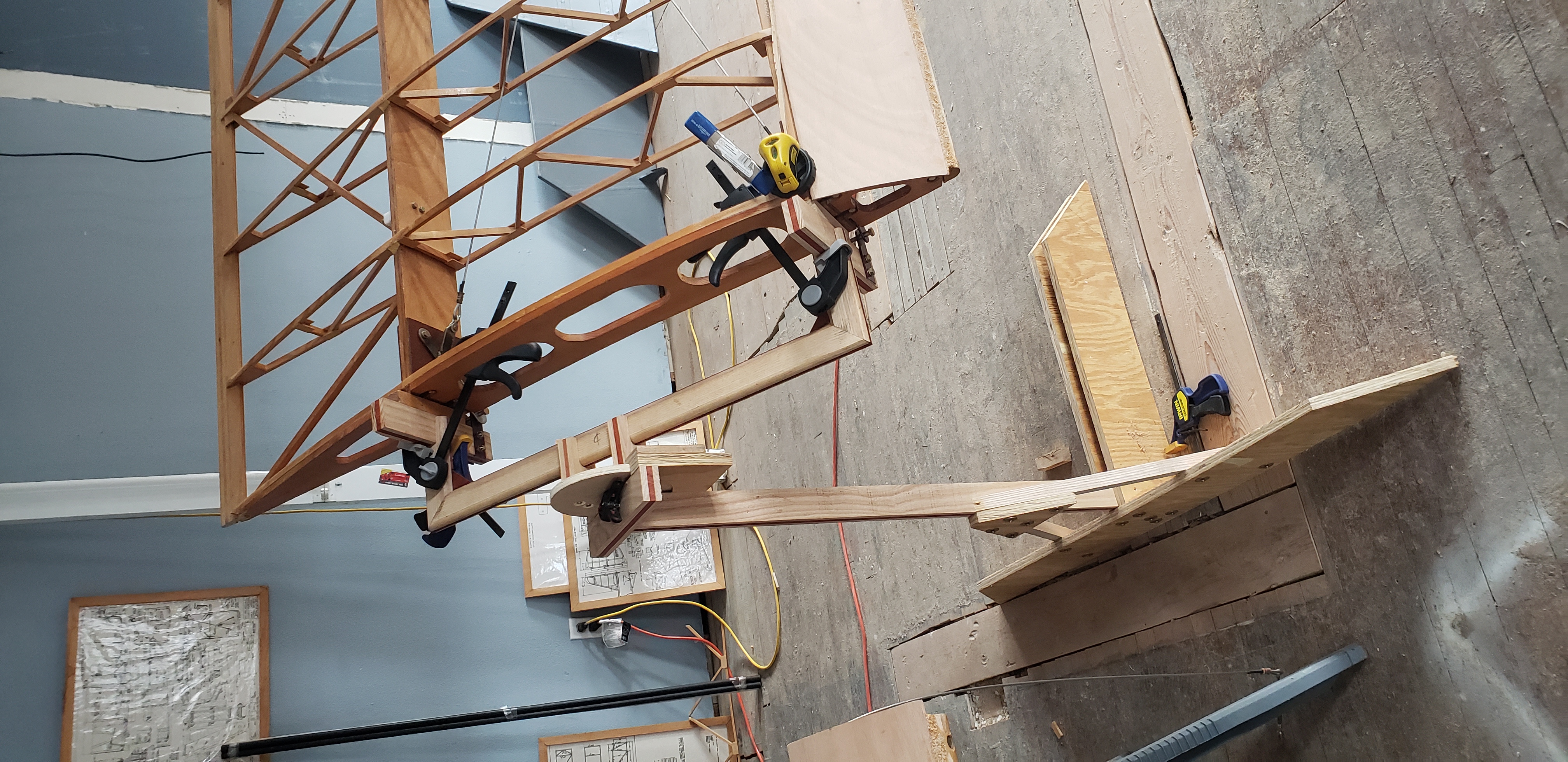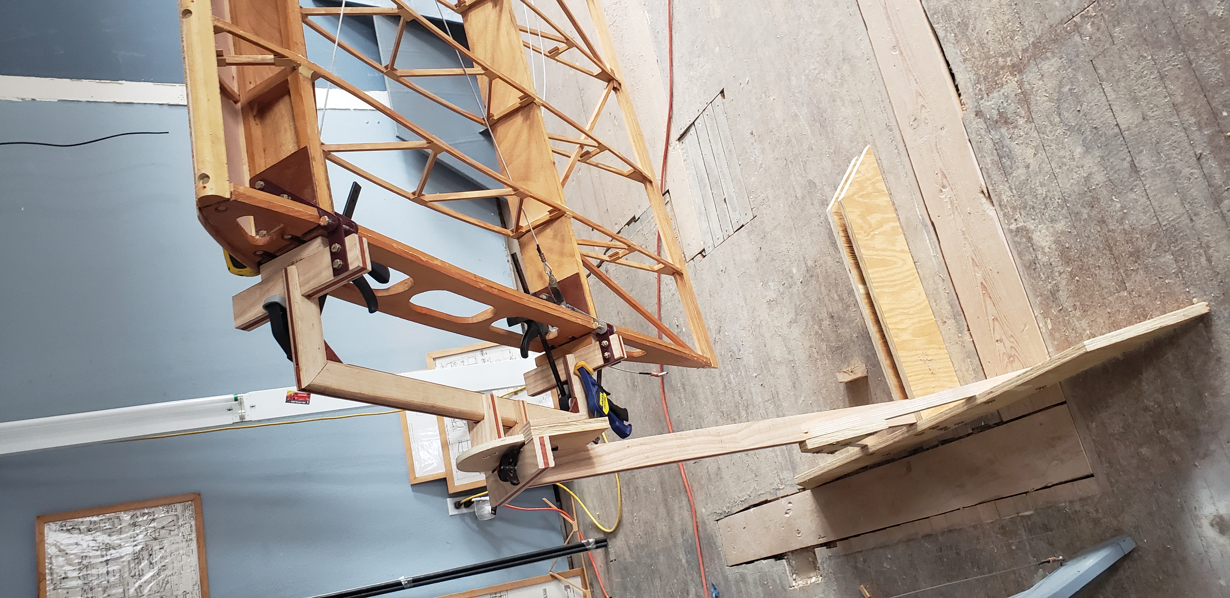 Here's how I handled the outboard wing rotator. I drilled a hole through the wing bow where the weight was approximately balanced and then installed a T-Nut on the inner face of the wing bow. I inserted a threaded rod from the wing to the rotator stand. A picture will make this clearer. Later, when the wings were finished and about ready for paint, I glued a hardwood dowel into the hole in each of the outer wing bows. Cheers, Ken